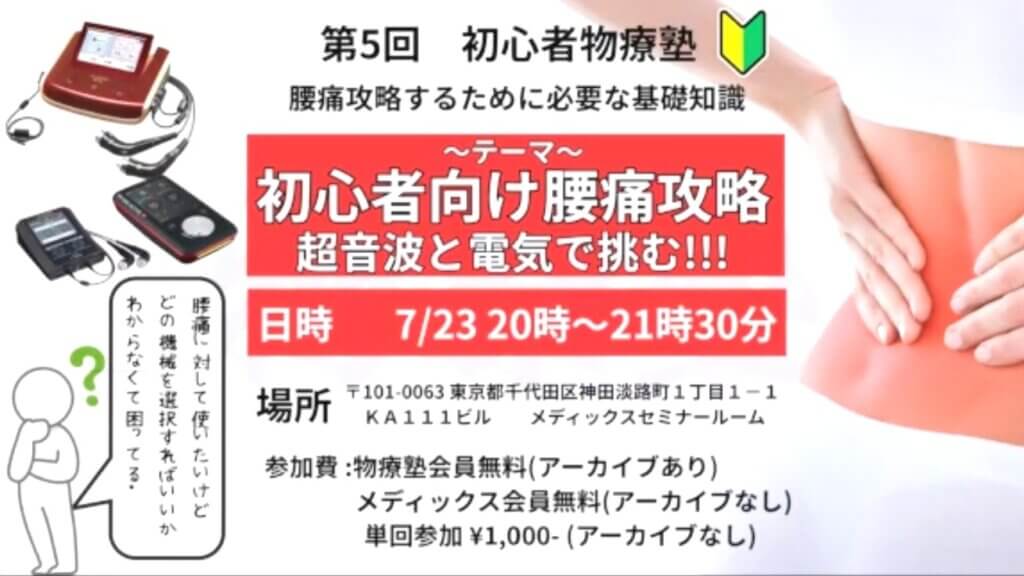 物療塾第5回目:超音波とハイボルテージで腰痛攻略 セミナースライドは、以下のリンクよりご確認ください。 -