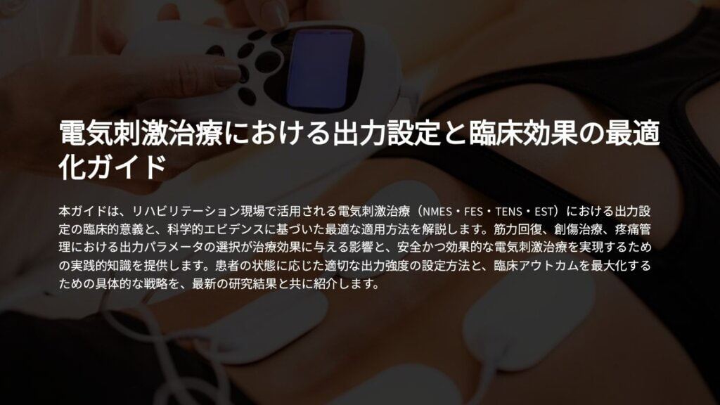 物療塾第6回目:電気刺激における出力設定 セミナースライドは、以下のリンクよりご確認ください。 -