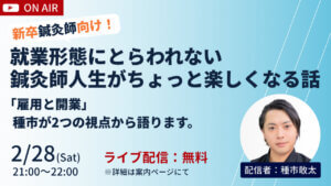 種市先生が、開業直後のひとり鍼灸院に向けたアドバイスなどを中心にお伝えいたします。