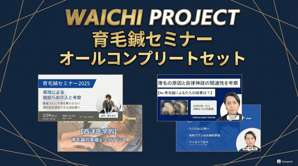 また、オールコンプリートセット(当コンテンツ)については、WAICHI PROJECTで育毛鍼セミナーを開催するたびに、アーカイブを追加(※)していきます。